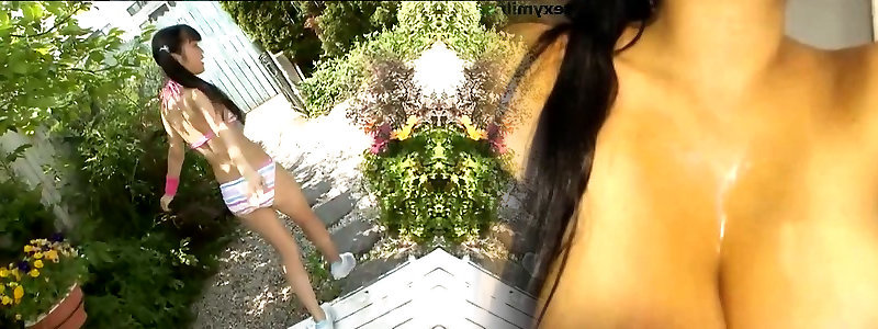Cute Korean college student poses in bikini in the garden
